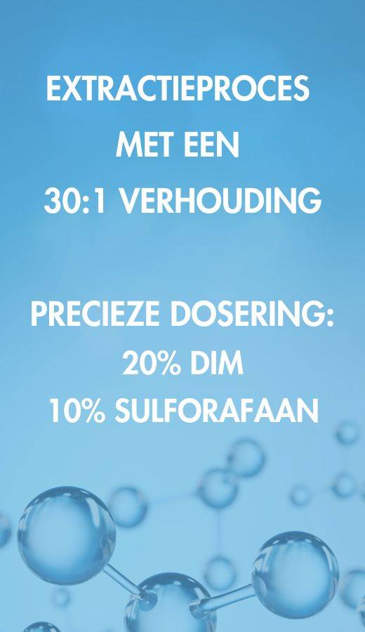Jonge broccolischeuten, zorgvuldig geselecteerd en verwerkt met respectvolle extractiemethoden, leveren een puur extract, zonder hulpstoffen of verontreinigingen. Deze zuiverheid garandeert een hoge biologische beschikbaarheid, oftewel een optimale opname door het lichaam, zodat DIM volledig zijn gunstige biologische effecten kan uitoefenen.