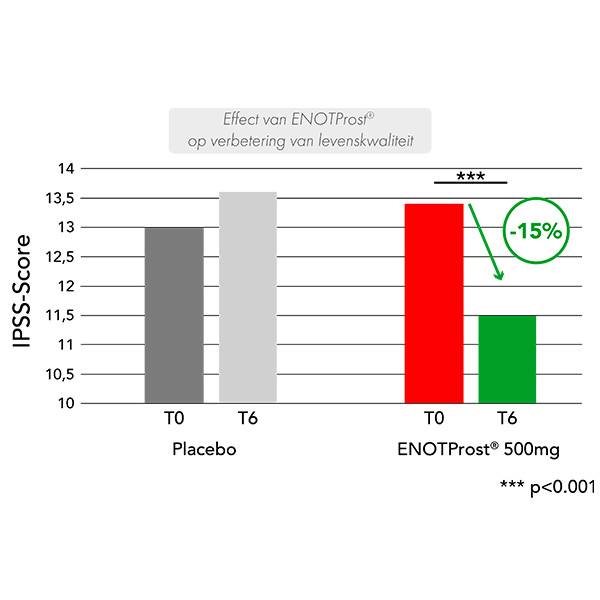 Verbetering in de kwaliteit van leven werd ook beoordeeld met behulp van de International Prostate Symptom Score (IPSS)-vragenlijst, die de ernst van BPH-symptomen meet. Suppletie met 500 mg ENOTProst® liet een verbetering zien in de kwaliteit van leven vergeleken met het begin van het onderzoek, met een significante vermindering van de IPSS-score van 15% (-2 punten; p<0,01), terwijl deze score significant toenam in de placebogroep na 6 maanden (p<0,01).