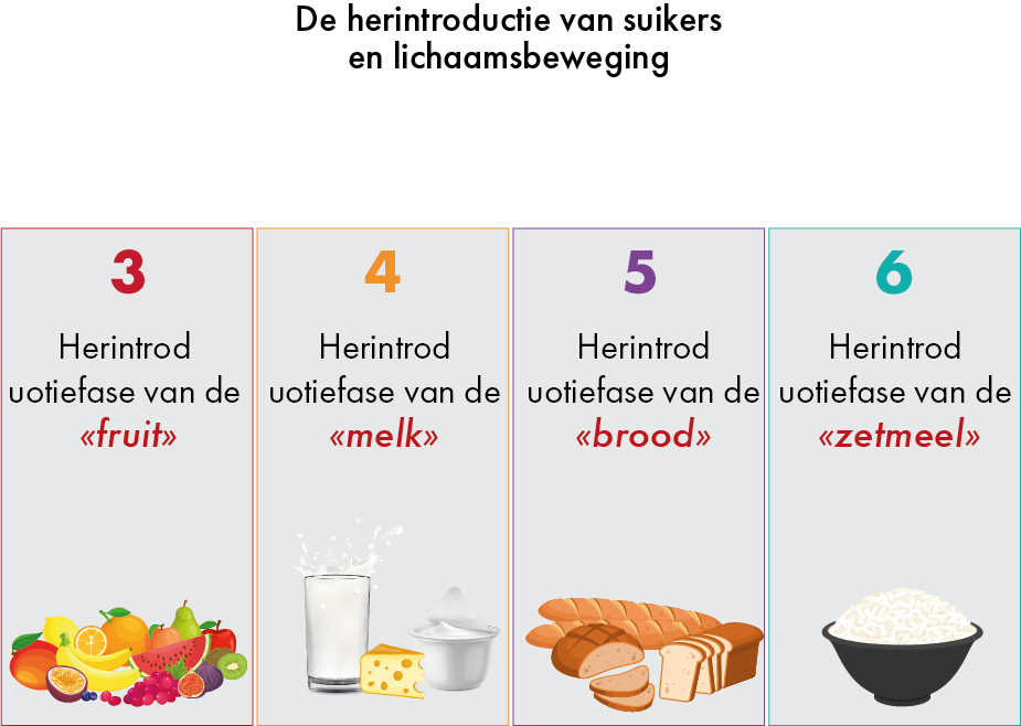 Na de actieve en selectieve fasen moet uiterste zorgvuldigheid worden betracht bij het herintroduceren van voedselgroepen. Inderdaad, elke herinvoering die te snel of onevenwichtig is kan leiden tot gewichtstoename. Als het gewichtsverlies tijdens deze fasen minder groot is (20% van het totale gewichtsverlies), is de naleving van deze stappen essentieel om de overgang naar een evenwichtige voeding te garanderen. Ze vinden plaats in 4 fasen waarbij zoete levensmiddelen met een lage glycemische index geleidelijk aan opnieuw worden geïntroduceerd. We zullen dus beginnen met fruit, dan zuivelproducten, dan volkorenbrood en ten slotte zetmeelrijke voedingsmiddelen.