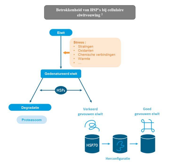 HSP's, ook wel "chaperone-eiwitten" genoemd, zijn beschermende eiwitten die zorgen voor de goede werking van cellen. Zij maken het mogelijk om te gaan met de schadelijke effecten van cellulaire stress, die kan worden veroorzaakt door fysieke parameters (hoge temperaturen, UV-straling, blootstelling aan zware metalen, enz.), of biologische parameters (infectie, hypoglykemie, anoxie (zuurstofgebrek in de lichaamsweefsels), oxidatieve stress, enz.)