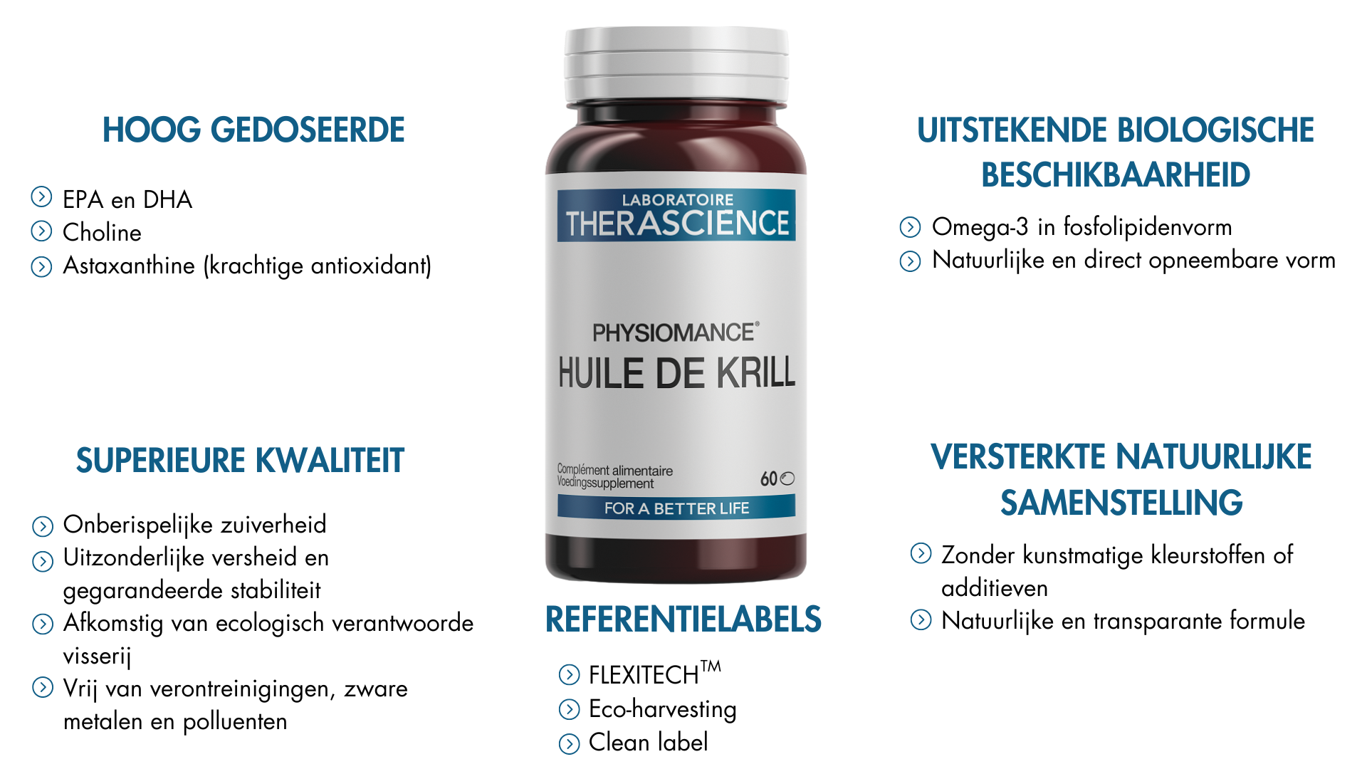 THERASCIENCE Laboratory heeft Antarctische krill geselecteerd, een uitzonderlijke mariene bron, van nature rijk aan fosfolipiden, omega-3 (EPA/DHA), choline en astaxanthine. Dankzij het gepatenteerde FLEXITECH™-proces worden de zuivering en concentratie van de olie streng gecontroleerd om steeds een consistente kwaliteit en precieze actieve stofgehaltes per dosis te garanderen.