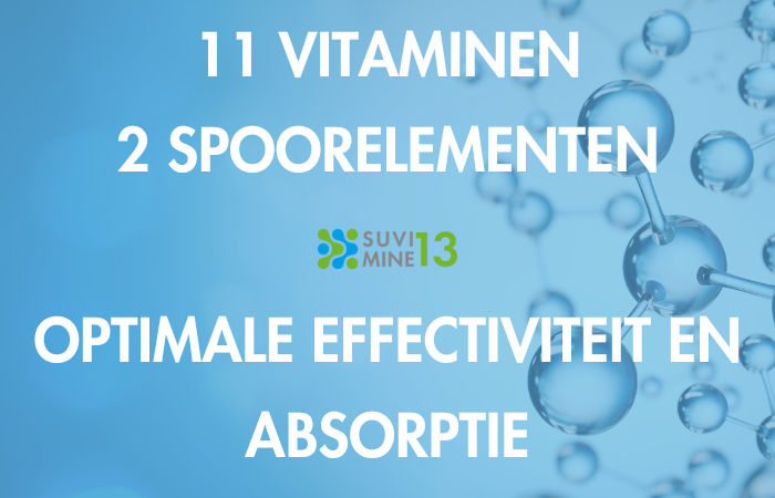 - - Suvimine 13® : Dit complex combineert 11 vitaminen en 2 sporenelementen om vermoeidheid te verminderen en de immuniteit te ondersteunen. Vitamine D3 en zink versterken de botgezondheid, terwijl selenium de cellen en de schildklierfunctie beschermt.