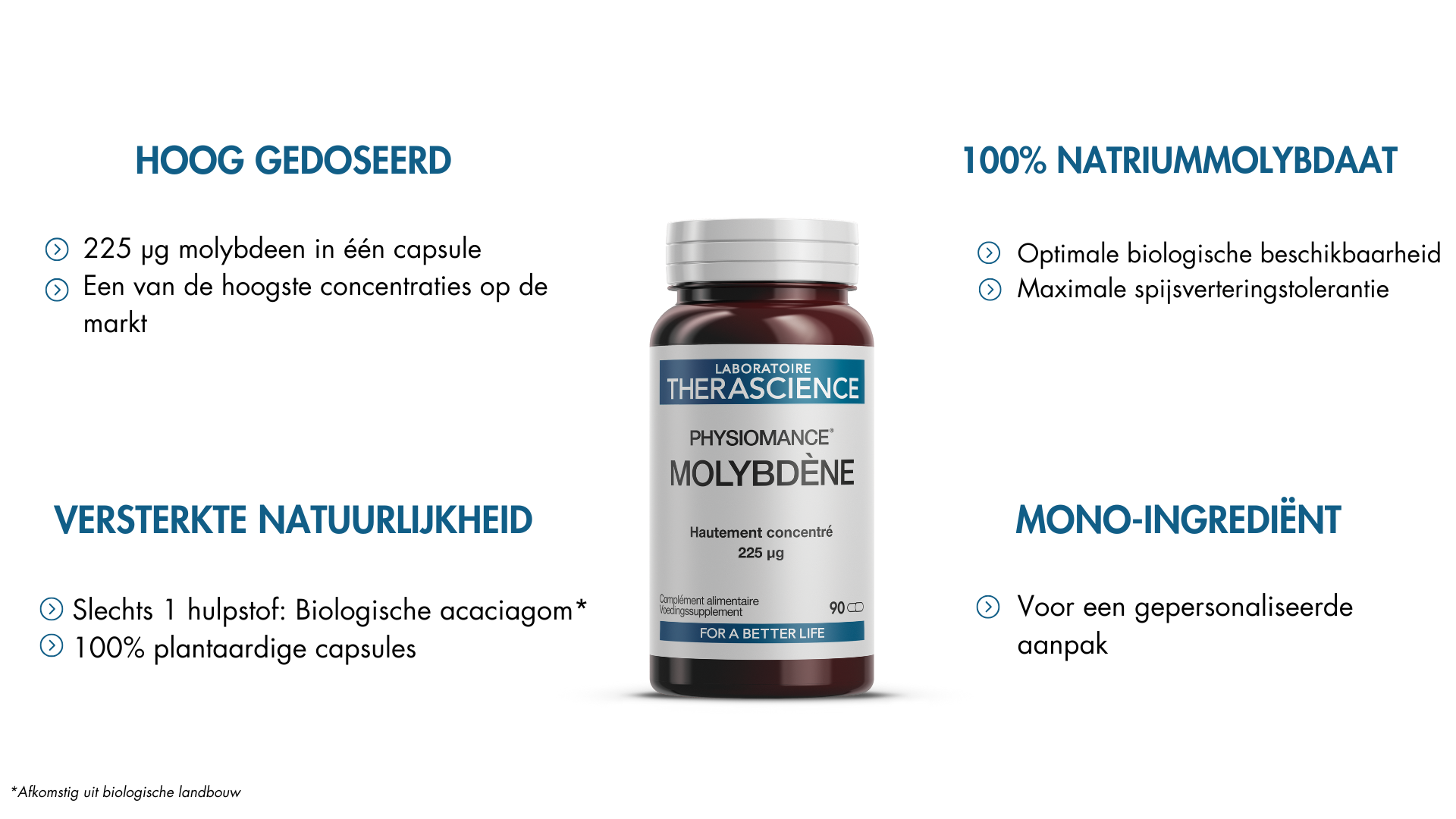 Door natriummolybdaat te integreren, benadrukt het THERASCIENCE Laboratorium een zeer hoogwaardige supplementatie, wetenschappelijk gevalideerd, ontworpen om veilig en gemakkelijk opneembaar molybdeen te leveren — een echte meerwaarde.