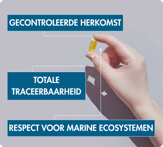 De visolie is afkomstig van kleine vette vissoorten uit ongerepte oceaangebieden, en is gecertificeerd door Friend of the Sea®. Deze hoogwaardige omega 3-concentraat respecteert de mariene ecosystemen en duurzame vispraktijken.