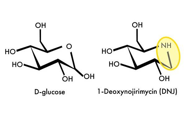 1- Deoxynojirimycine (DNJ) heeft een structuur die lijkt op die van glucose. Door deze gelijkenis kan het de afbraak van complexe suikers voorkomen, en dus hun terechtkomen in de bloedbaan voordat ze door de cellen worden gebruikt of opgeslagen. DNJ voorkomt daarom een snelle stijging van de bloedglucosespiegel (gehalte van de bloedsuiker).