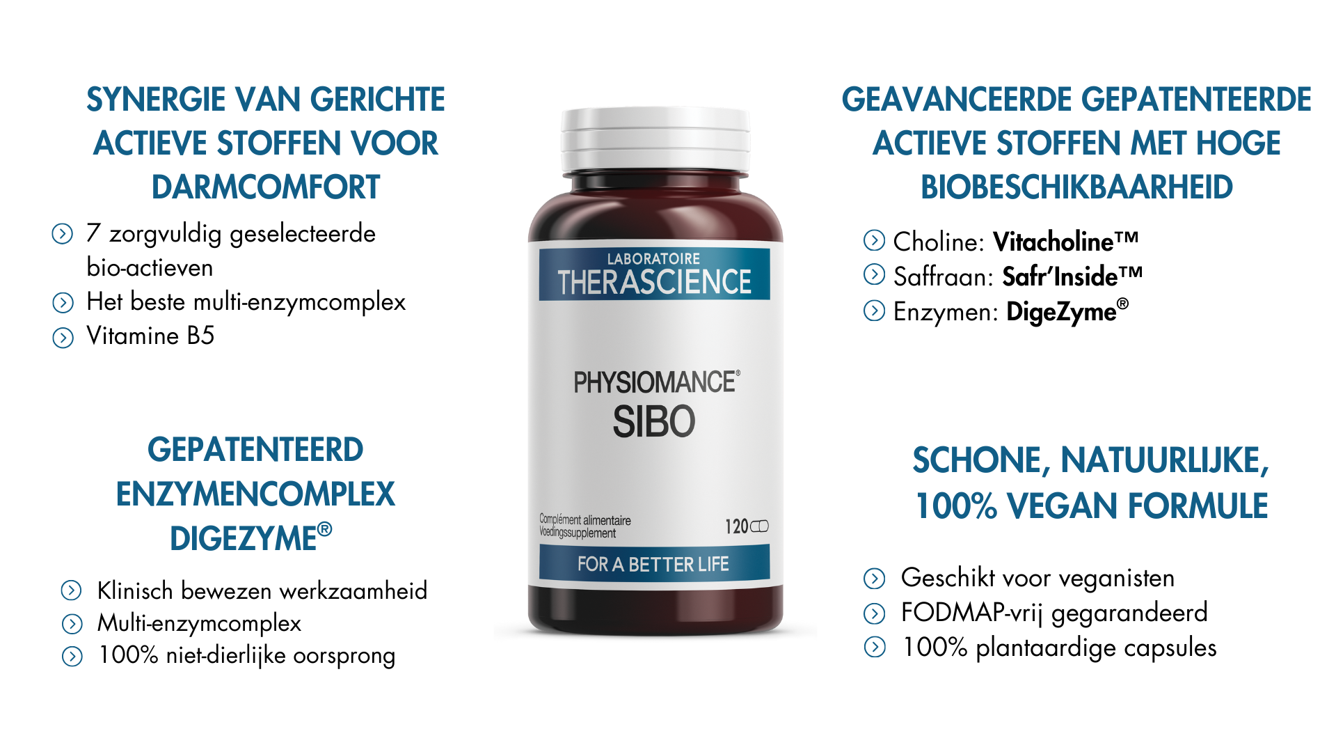 In tegenstelling tot klassieke enzymcomplexen die vaak van dierlijke pancreatische oorsprong zijn, wordt DigeZyme® verkregen door gecontroleerde fermentatie van GRAS (Generally Recognized As Safe) micro-organismen, zoals Aspergillus oryzae, Bacillus subtilis, Rhizopus oryzae en Trichoderma longibrachiatum. Dit procedé garandeert niet alleen een strikte traceerbaarheid en reproduceerbaarheid, maar ook een uitstekende spijsverteringstolerantie. Het resultaat is een oplossing die compatibel is met vegetarische, veganistische en clean-label diëten. De interesse in exogene enzymtoevoer is des te meer gerechtvaardigd bij functionele darmstoornissen of pathologieën zoals SIBO, waarbij de productie van endogene spijsverteringsenzymen verminderd kan zijn (leeftijd, stress, ontsteking, hypochlorhydrie...). Door DigeZyme® in zijn formulering op te nemen, steunt PHYSIOMANCE® SIBO op geavanceerde enzymtechnologie.