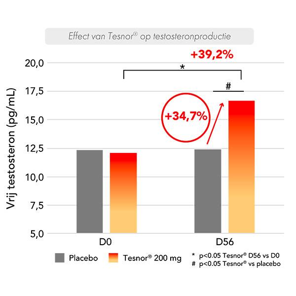 Een gerandomiseerd, dubbelblind, placebogecontroleerd klinisch onderzoek met 75 mannen tussen 36 en 55 jaar toonde aan dat dagelijkse supplementatie met 200 mg Tesnor® gedurende 56 dagen de concentratie vrij testosteron aanzienlijk verhoogde met 39,2% vergeleken met D0, en met 34,7% vergeleken met placebo1. Tesnor® granaatappel- en cacao-extract is dus een natuurlijke testosteronversterker.