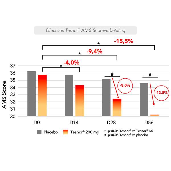 In hetzelfde onderzoek werd de werkzaamheid van Tesnor® zelf beoordeeld met behulp van de Aging Male Symptoms (AMS) referentievragenlijst, die helpt bij het diagnosticeren van testosterontekort (verminderde spierkracht, seksueel verlangen, aantal erecties, enz.) Hoe hoger de AMS-score, hoe groter het testosterontekort1. Suppletie met 200 mg Tesnor® resulteerde in een significante verbetering van AMS: vergeleken met D0: -9,4% op D28 en -15,5% op D56, vergeleken met placebo: -8,0% op D28 en -12,8% op D56.