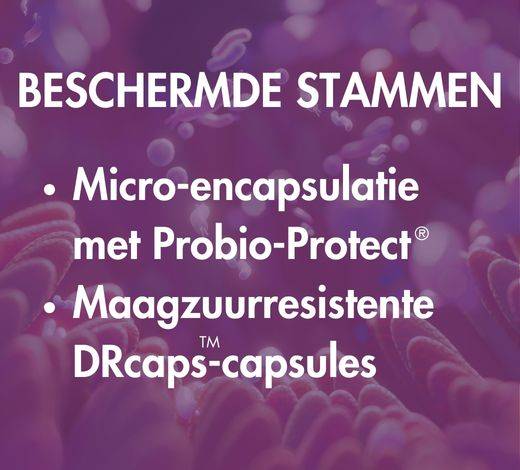 - Optimale biologische beschikbaarheid: individueel micro-ingekapselde microbiotastammen (Probio-Protect®) verpakt in DR capsTM maagsapresistente capsules;