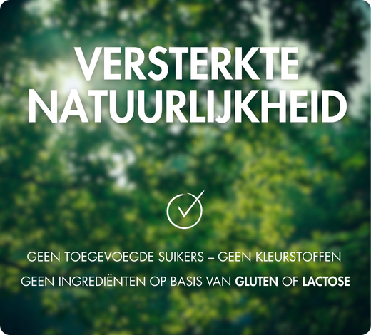 Kwaliteitsverbintenis die natuurlijke formules garandeert, van werkzame stoffen tot hulpstoffen, zonder kunstmatige kleur- of smaakstoffen, zonder aspartaam, titaniumdioxide-vrij, zonder GMO, nanodeeltjes-vrij, niet bestraald, colloïdaal siliciumdioxide-vrij, zonder conserveermiddelen, niet getest op dieren en geproduceerd in Europa.