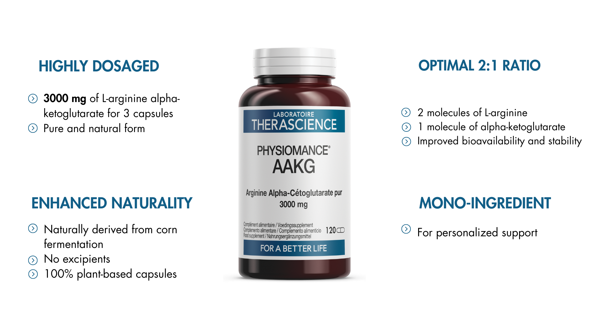 PHYSIOMANCE® AAKG é uma fórmula altamente concentrada, com 3.000 mg de L-arginina alfa-cetoglutarato puro e natural por dia (6 cápsulas). O Laboratoire Therascience selecionou um sal de AAKG composto por 2 moléculas de L-arginina e 1 molécula de alfa-cetoglutarato. Esta proporção de 2:1 garante biodisponibilidade e estabilidade ótimas do sal. Sendo um suplemento mono-ingrediente, o PHYSIOMANCE® AAKG permite um acompanhamento personalizado. Além disso, a L-arginina alfa-cetoglutarato é obtida por fermentação natural do milho, o produto é isento de excipientes e apresentado em cápsulas 100% vegetais.