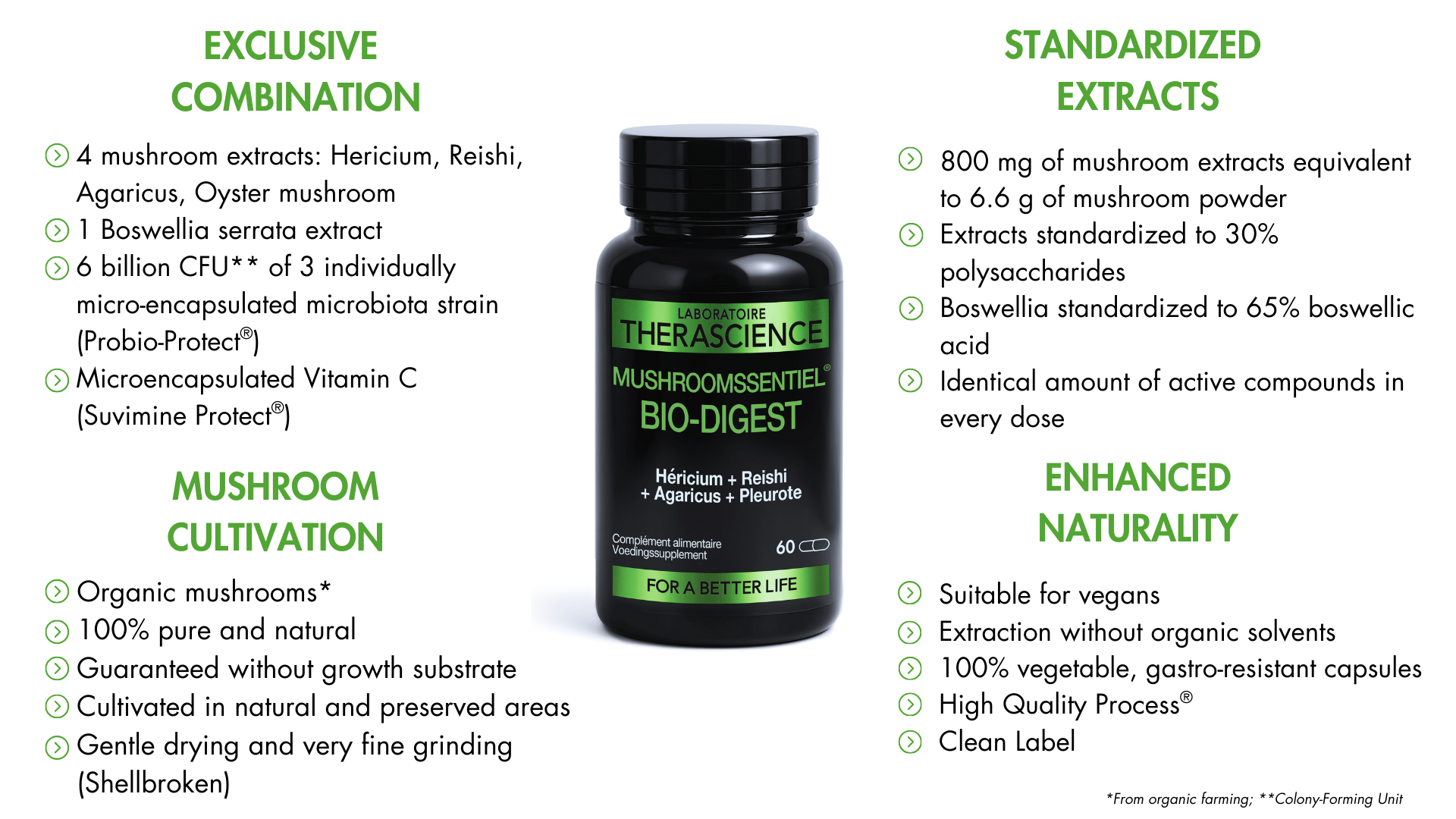 Escolher MUSHROOMSSENTIEL® Bio-Digest significa optar por uma fórmula que atende aos mais exigentes padrões científicos e por cogumelos premium graças a extratos altamente dosados. Uma solução ideal para beneficiar plenamente das propriedades do Hericium, Reishi, Agaricus blazei e Cogumelo ostra.