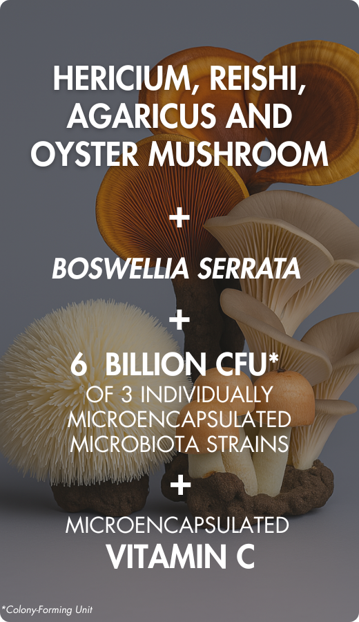Além disso, os nossos extratos de esporóforos (as partes visíveis e ativas) de Hericium, Reishi, Agaricus blazei e Cogumelo ostra são precisamente padronizados a 30% de polissacarídeos (moléculas ativas). Além disso, o nosso extrato de Boswellia serrata também é padronizado e titulado a 65% de ácido boswélico.