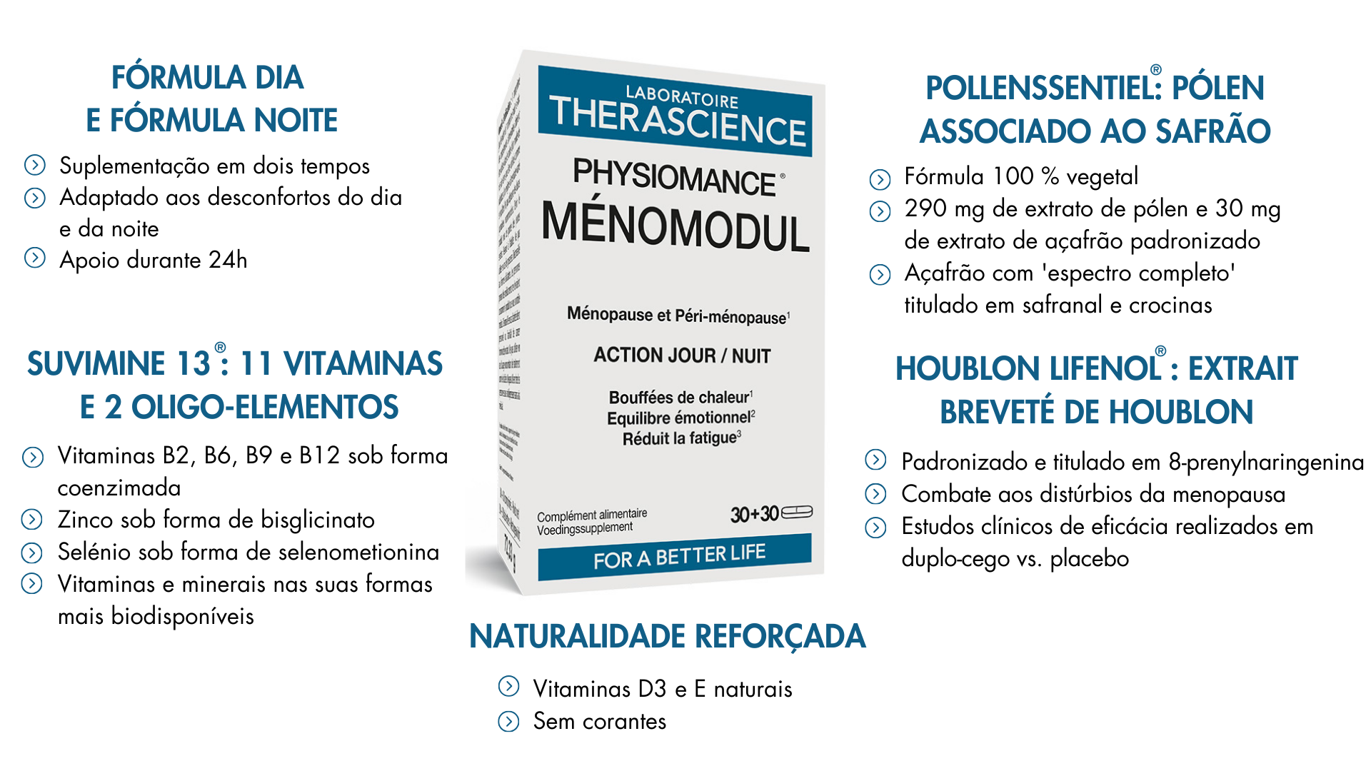 PHYSIOMANCE® Ménomodul oferece uma solução inovadora e adaptada para acompanhar as mulheres durante esse período de transição. Graças à sua ação dupla dia e noite, atua de forma eficaz ao longo de 24 horas para aliviar os desconfortos da menopausa.