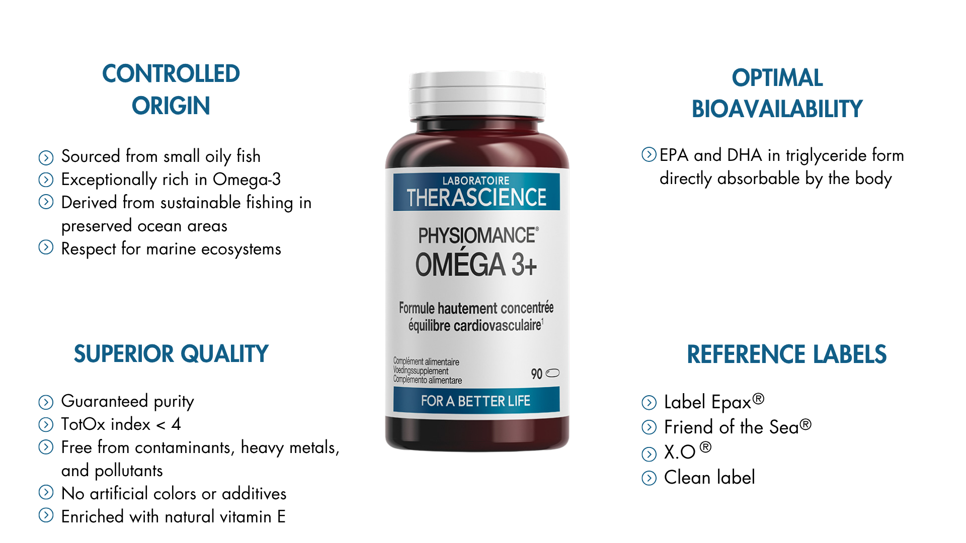 Os óleos de peixe usados no PHYSIOMANCE® Omega 3+ provêm de pequenos peixes como arenques, sardinhas e anchovas, cuidadosamente selecionados pela sua excepcional riqueza em ômega 3. Esses peixes, situados na base da pirâmide alimentar, apresentam um teor naturalmente elevado de ácidos graxos essenciais, reduzindo consideravelmente os riscos de contaminação por metais pesados ou outras substâncias tóxicas,garantindo assim uma pureza ótima.