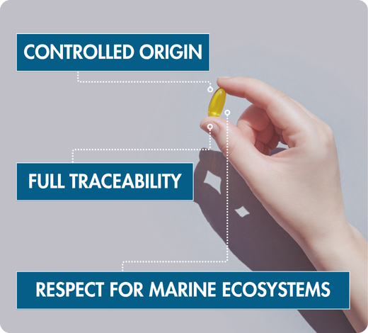 O óleo de peixe selecionado possui um índice TotOx < 4, garantindo sua frescura e estabilidade. É isento de contaminantes, metais pesados e poluentes. Enriquecido com vitamina E natural, de propriedades antioxidantes, o óleo é assim protegido contra a oxidação. Sem corantes nem aditivos artificiais, ele possui as certificações Epax®, X.O® e Clean Label.