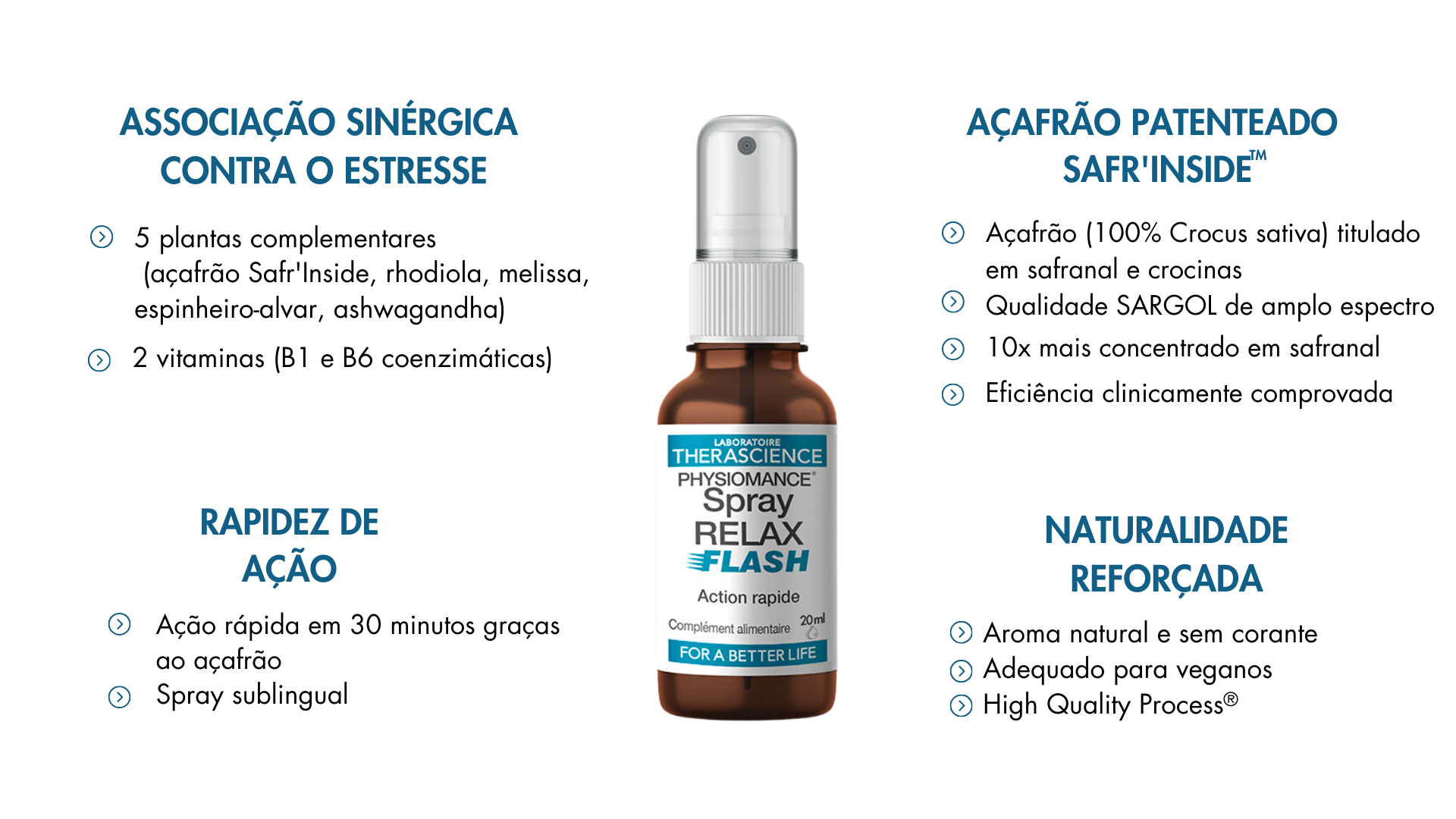 PHYSIOMANCE® Spray Relax Flash combina extratos de plantas reconhecidas por suas propriedades calmantes e adaptogênicas com vitaminas essenciais para o funcionamento normal do sistema nervoso.