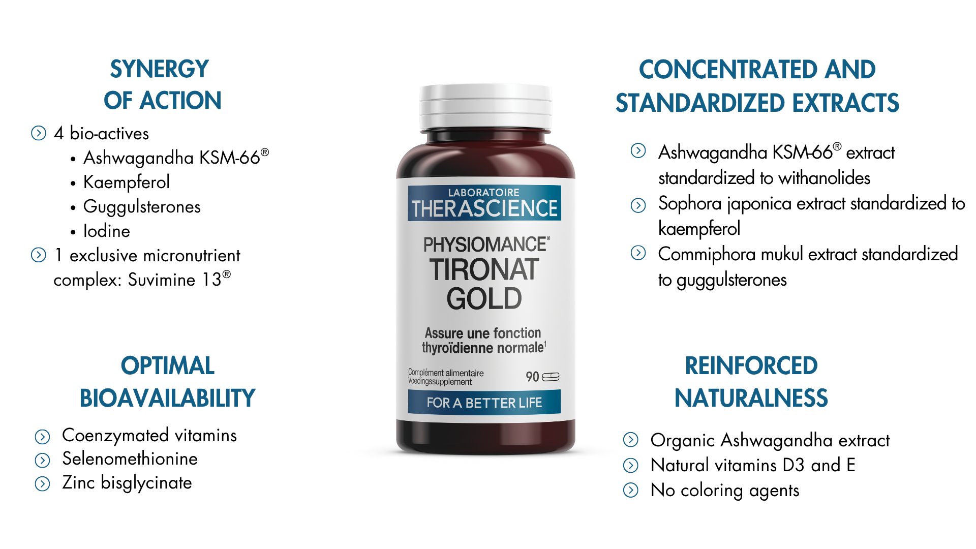 PHYSIOMANCE® Tironat Gold fornece, por 3 comprimidos por dia, 300 mg de extrato patenteado de ashwagandha KSM-66® padronizado em withanolides, com eficácia clinicamente demonstrada, 500 mg de extrato de Sophora japonica padronizado em kaempferol, 400 mg de extrato de Commiphora mukul padronizado em guggulsteronas, 150 µg de iodo, bem como o complexo micronutricional Suvimine 13®, que inclui 11 vitaminas (B1, B2, B3, B5, B6, B8, B9, B12, C, D3 e E naturais) e 2 oligoelementos (zinco e selénio), todos selecionados sob formas altamente biodisponíveis para uma assimilação ótima: vitaminas coenzimadas, selenometionina e zinco na forma de bisglicinato. PHYSIOMANCE® Tironat GOLD fornece assim 100% dos VR** em zinco, 182% dos VR** em selénio e 50% dos VR** em vitaminas B, C, D3 e E naturais por 3 comprimidos.