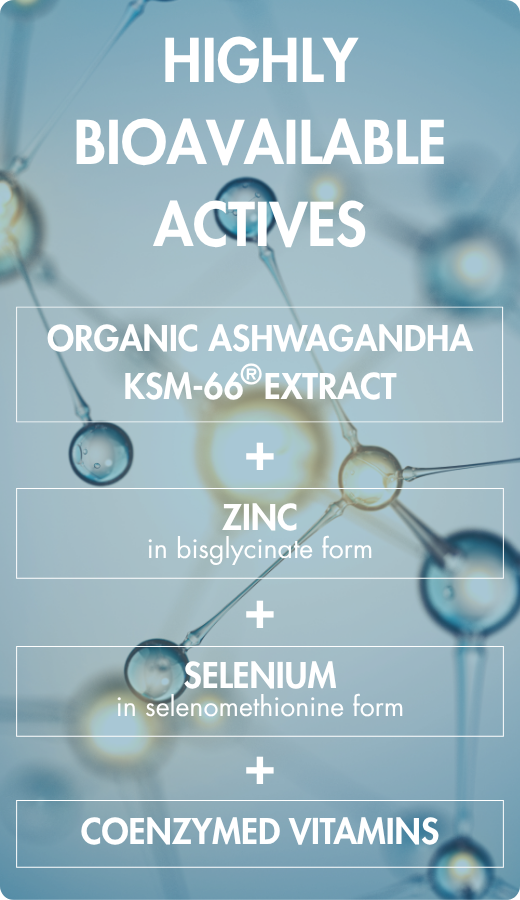 Por fim, a naturalidade da fórmula é garantida pela utilização de um extrato de ashwagandha KSM66® proveniente da agricultura biológica, de vitaminas naturais D3 e E e pela ausência de corantes.